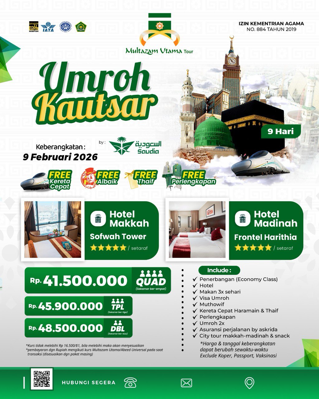 Paket UMROH KAUTSAR SILVER (09 FEBRUARI 2026) 09 DAYS | SOFWAH TOWER dirancang untuk memberikan pengalaman ibadah yang nyaman, khusyuk, dan penuh makna bagi para jamaah. Dengan fasilitas terbaik, layanan profesional, serta bimbingan spiritual yang terpercaya, paket ini menjadi pilihan tepat untuk Anda yang ingin menjalankan umroh dengan tenang dan terarah, baik untuk perjalanan pertama maupun lanjutan di Tanah Suci.
